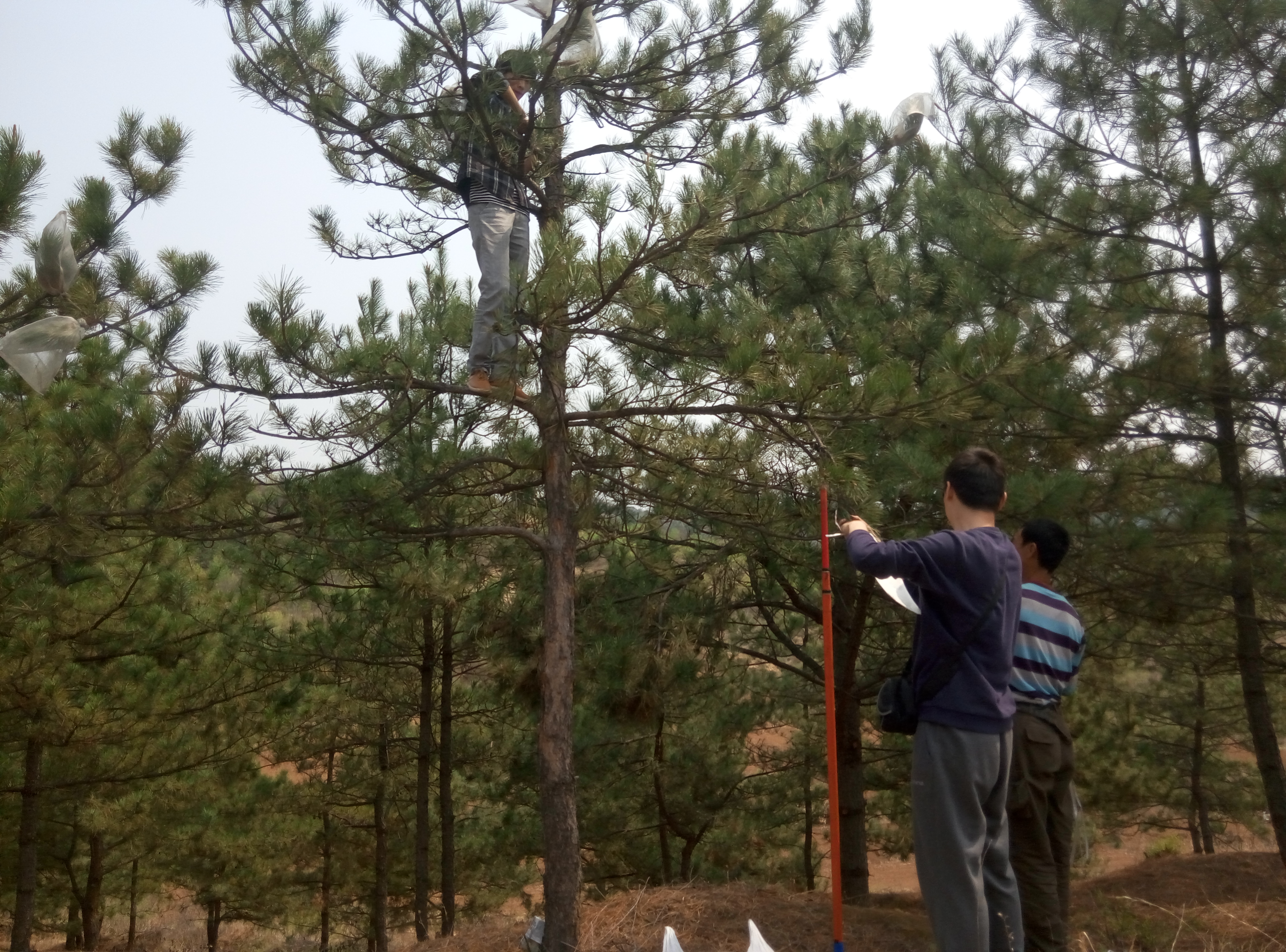 近日,北京林业大学教授钮世辉来基地做油松控制授粉实验,他此次实验目的主要是研究基于构建经强度选择的自交分离群体(>1000株),鉴定油松纯合致死或衰退关键位点,并以杂交群体为材料鉴定该位点多态性对杂种优势形成的影响,以此开发油松杂种优势分子检测标记。